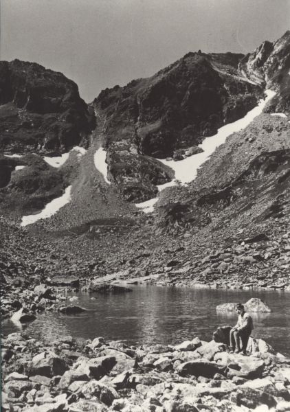 Staw Staszica w Dolinie za Mnichem. Na kamieniu przed nim siedzi chłopiec. W tle Wrota Chałubińskiego.