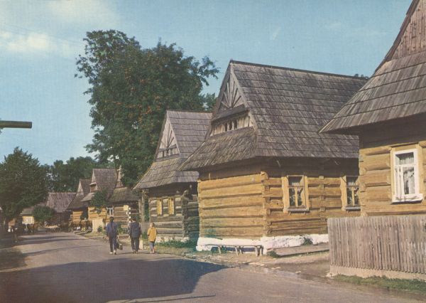 Zabudowania wiejskie w Chochołowie. Drogą idą dzieci.
