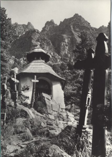Tatry Wysokie - Dolina Mięguszowiecka. Symboliczny cmentarz, kapliczka z detwiańskimi rzeźbionymi krzyżami. Tytuł również w języku: ros., niem.