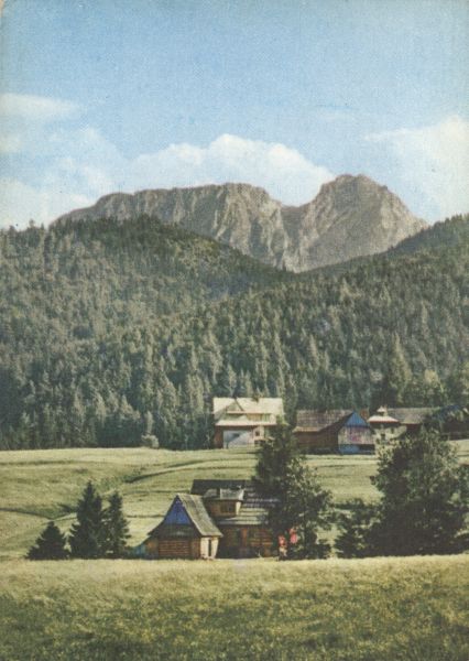 Widok na Giewont z Zakopanego, na pierwszym tle domy, w tle Giewont.