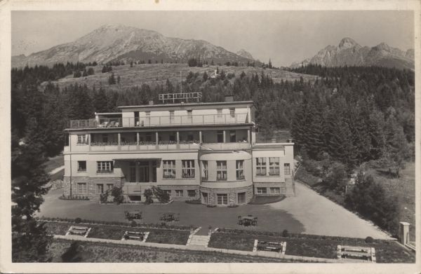 Budynek pensjonatu Helios w Górnym Smokowcu. W tle Sławkowski Szczyt i Łomnica.