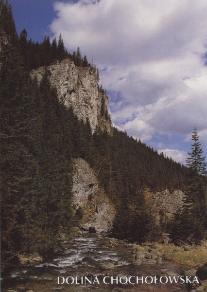 Wyżnia Brama Chochołowska w Dolinie Chochołowskiej. W dole płynie Potok Chochołowski. Na dole napis: DOLINA CHOCHOŁOWSKA.