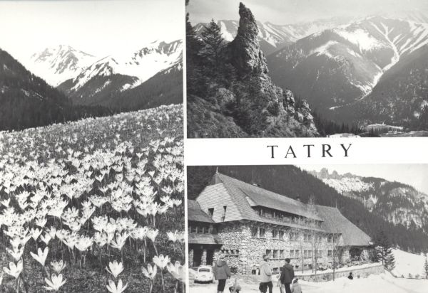 Schronisko PTTK na Polanie Chochołowskiej. Pomiędzy zdjęciami po prawej stronie napis: TATRY.