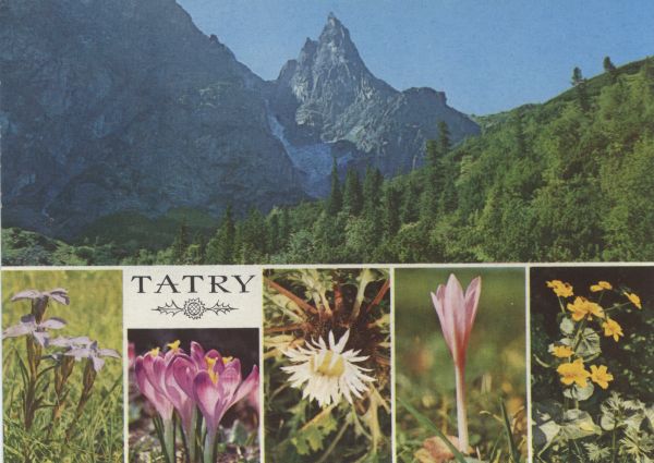 Pocztówka 6. elementowa. Na górnym zdjęciu Mnich nad Morskim Okiem. Poniżej kwiaty występujące w Tatrach, od lewej: goryczuszka orzęsiona, krokus, dziewięćsił bezłodygowy, zimowit jesienny, knieć górska (kaczeniec). Napis TATRY.