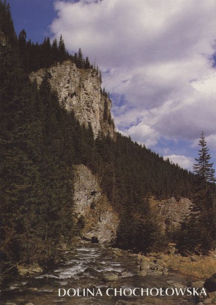 Wyżnia Brama Chochołowska w Dolinie Chochołowskiej. W dole płynie Potok Chochołowski. Na dole napis DOLINA CHOCHOŁOWSKA.