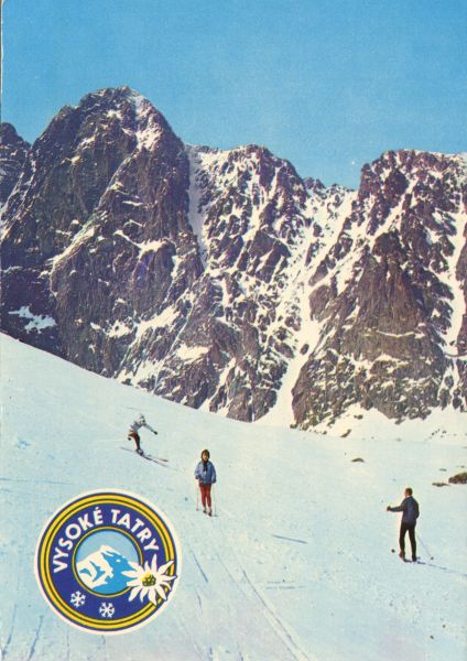 Jazda na nartach w Dolinie £omnickiej. W tle z lewej Kieæmarski Szczyt, z prawej Huncowski Szczyt. Na dole logo miasta VYSOKÉ TATRY.