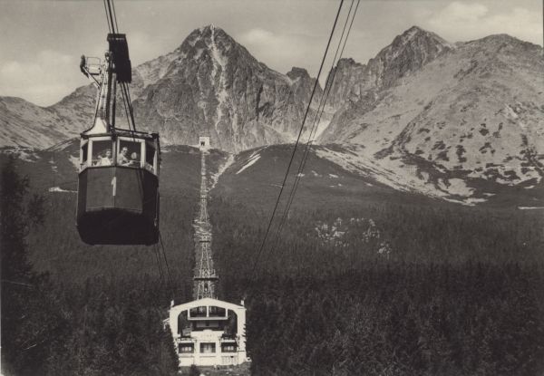 Wagonik kolei linowej na Łomnicę. W dole i pośrodku stacje pośrednie. W tle Łomnica, Grań Wideł i Kieżmarski Szczyt.