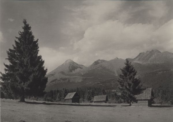 Widok z ważeckiej polany: Krywań, Krótka, z tyłu Ostry, w przodzie Siodełkowa Kopa, Furkot, Wielkie Solisko. Na polanie szałasy.