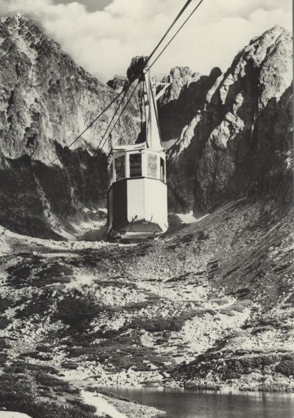 Wagonik kolei linowej na Łomnicê, w tle Łomnica i Kieżmarski Szczyt. W dole Łomnicki Staw.