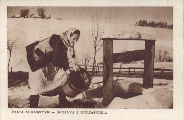 Murzasichle zimą. Góralka Maria Łukaszczyk przy studni.