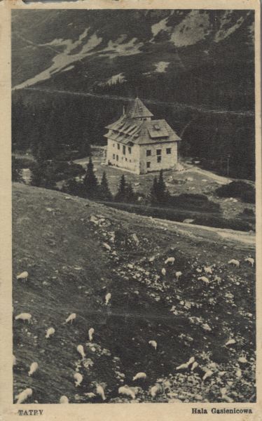 Schronisko Murowaniec na Hali G±sienicowej. Na pierwszym planie widać pas±ce się owce. Pod zdjęciem napis: TATRY. Hala G±sienicowa.