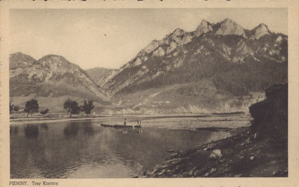 Trzy Korony w Pieninach widoczne z Czerwonego Klasztoru. Na Dunajcu widoczni flisacy. Pod zdjęciem drukowany tytuł pocztówki.