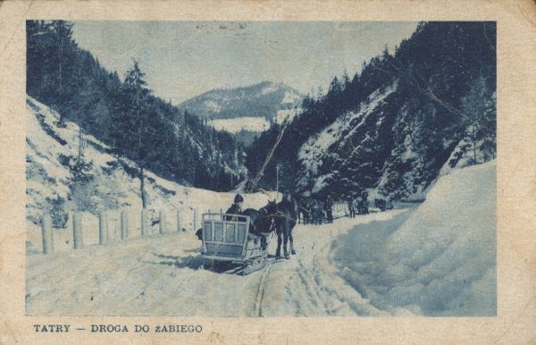 Sanie na zaśnieżonej drodze do Morskiego Oka w Dolinie Rybiego Potoku. Pod zdjęciem drukowany tytuł.