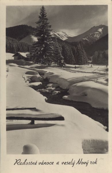 Zimowy pejzaż z Jaworzyny. Pod zdjęciem tekst życzeń: Radostné vánoce a veselý Nový rok.