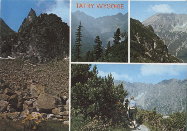 Widok ze szlaku na otoczenie Dolinki Buczynowej. U góry napis: TATRY WYSOKIE.