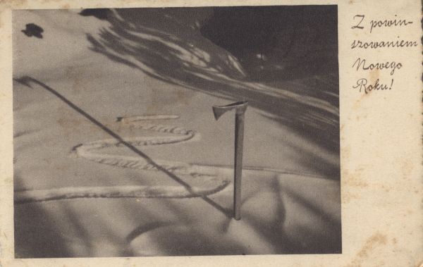 Ciupaga wbita w śnieg. Na marginesie napis