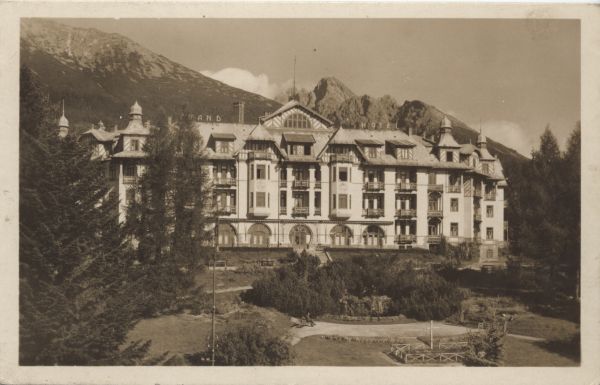 Budynek Grand Hotelu w Starym Smokowcu. Na pierwszym planie park. W tle po prawej stronie widać grupę Łomnicy, po lewej stoki Sławkowskiego Szczytu.
