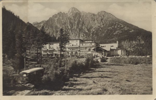 Związkowy dom wypoczynkowy na Siodełku. Widoczny dojeżdżający ze Starego Smokowca wagon kolei linowo-terenowej. W tle Łomnica.
