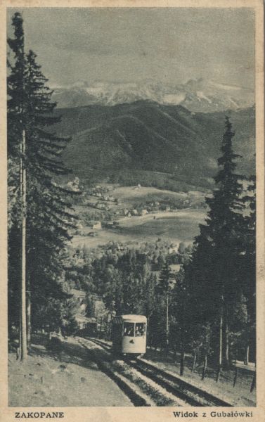 Kolej linowo - terenowa na Gubałówkę. W tle widok na Tatry. Pod zdjęciem opis: ZAKOPANE. Widoki z Gubałówki.