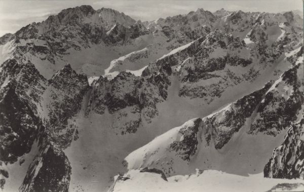 Vysoké Tatry - Pohľad s vrcholu Lomnického štítu 2636 m. Stalinov štít 2663 m. Vysoká 2565 m. Kriváň 2496 m. Veľká studená dolina, Prostredný hrebeň, Malá studená dolina