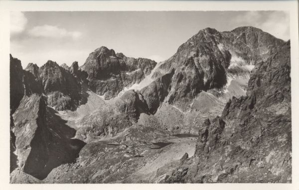 Tatry Wysokie - Dolina Małej Zimnej Wody. Schronisko Téryego Klubu Słowackich Turystów i Narciarzy, Pięć Stawów Spiskich, z prawej Lodowy Szczyt.