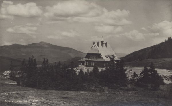 Schronisko na Hali Miziowej. Na dole po prawej stronie napisany tytuł pocztówki.