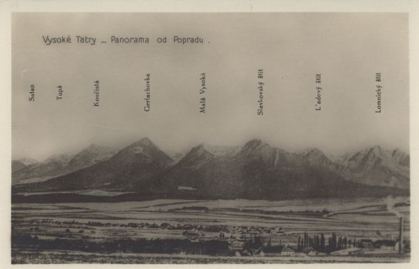 Panorama Tatr z Popradu. U góry po lewej stronie napis: Vysoké Tatry - Panorama od Popradu. Nad wybitniejszymi szczytami podano ich nazwy.