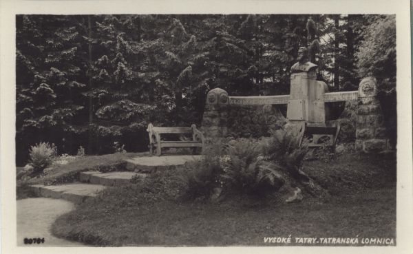 Pomnik żupana spiskiego Zeno Csákyego z 1908 r. w parku zdrojowym w Tatrzańskiej Łomnicy. U dołu po prawej stronie zdjęcia tytuł: VYSOKÉ TATRY - TATRANSKÁ LOMNICA