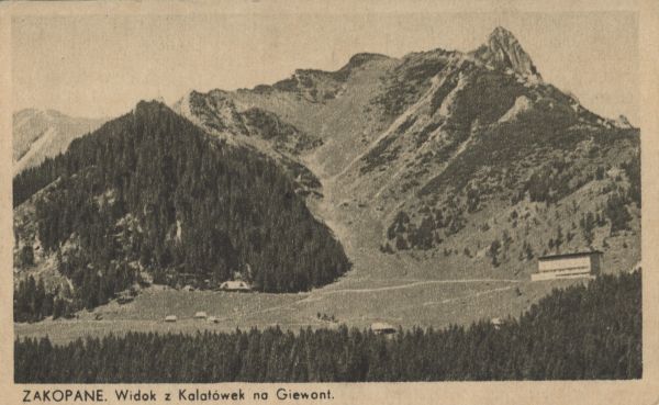 Hotel górski na Polanie Kalatówki. W tle Długi Giewont. Pod zdjęciem wydrukowany tytuł.