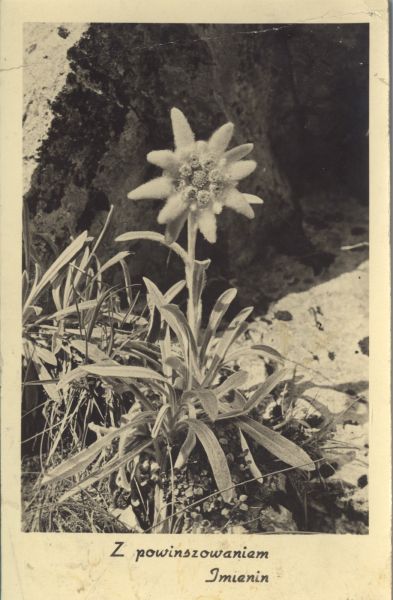 Kwitnąca szarotka alpejska (Leontopodium alpinum). Pod zdjęciem nadruk: Z powinszowaniem Imienin.
