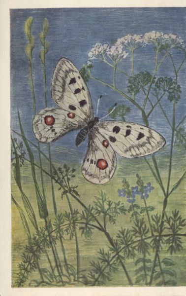 Reprodukcja obrazu Romana Owidzkiego przedstawiająca motyla Niepylaka apollo.