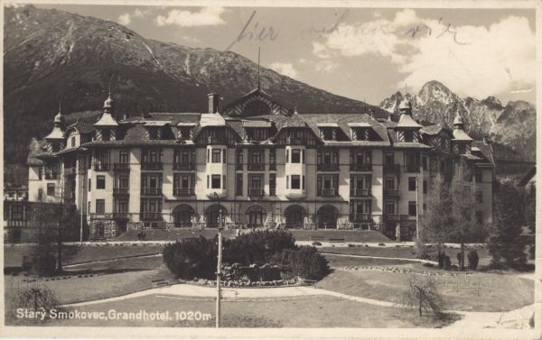 Budynek Grand Hotelu w Starym Smokowcu. Na pierwszym planie park. W tle po prawej stronie widaæ grupê Łomnicy, po lewej stoki Sławkowskiego Szczytu. W lewym dolnym rogu napis Starę Smokovec. Grand hotel. 1020 m.