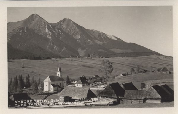 Zabudowania wiejskie i kościół w Zdziarze. W tle Płaczliwa Skała i Hawrań. Na dole po prawej stronie zdjęcia opis: VYSOKÉ TATRY, Ždiar. Hohe Tatra - Haus Sportpension.