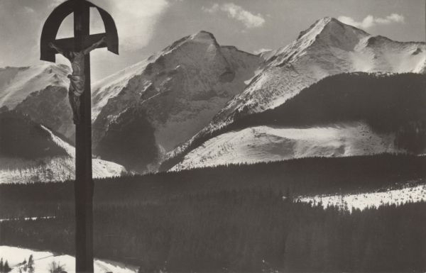 Przydrożny krzyż w Zdziarze. W tle zimowy widok na Płaczliwą Skałę i Hawrań.