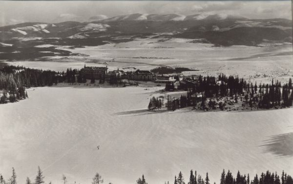 Szczyrbskie Jezioro w zimie. Nad brzegiem Hotele Krywań i Hviezdoslav. W tle Niżne Tatry.