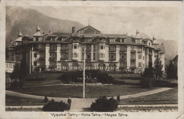Widok na budynek Grand Hotelu w Starym Smokowcu. Na pierwszym planie park. W tle po prawej stronie grupa Łomnicy, po lewej stoki Sławkowskiego Szczytu. Pod zdjęciem tytuł, ownież w języku niemieckim i węgierskim.