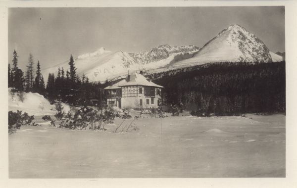 Willa Marina nad Szczyrbskim Jeziorem w zimie. W tle Krywań, Siodełkowa Kopa i Wielkie Solisko.