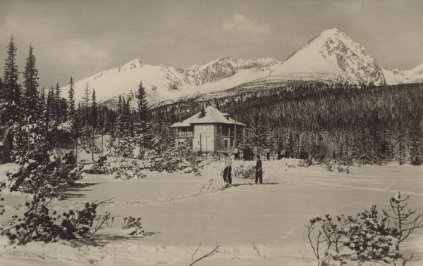 Willa Marina nad Szczyrbskim Jeziorem w zimie. Na stawie dwoje narciarzy. W tle Krywań, Siodełkowa Kopa, Ostra i Wielkie Solisko.