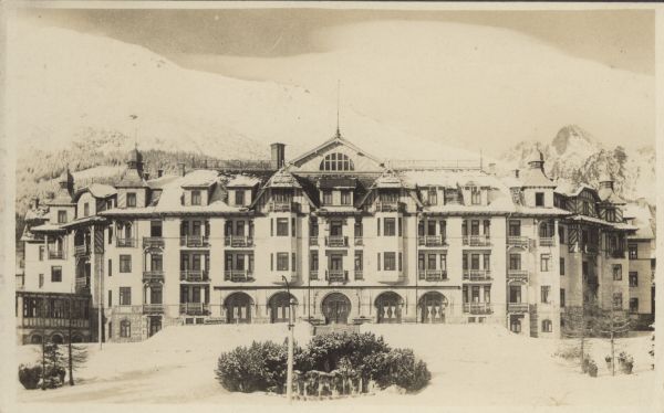 Na pierwszym planie budynek Grand Hotelu w Starym Smokowcu w zimowej scenerii. W tle po lewej stronie Sławkowski Szczyt, po prawej grupa Łomnicy.