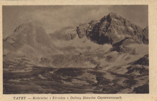 Widok na Kościelec i Świnicę z Doliny Stawów Gąsienicowych. Pod zdjęciem drukowany tytuł: TATRY - Kościelec i Świnica z Doliny Stawów Gąsienicowych.