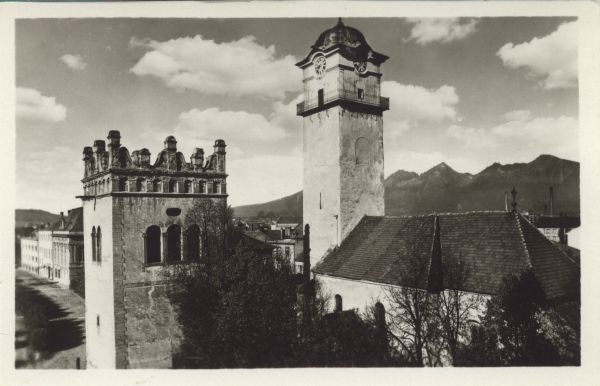 Kościół p.w. św. Idziego i renesansowa dzwonnica na rynku w Popradzie. W tle Kończysta.
