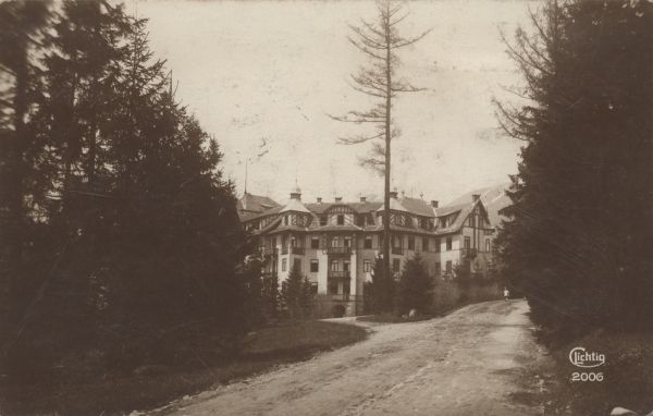 Droga prowadząca do Grand Hotelu w Starym Smokowcu. W centralnej części widać hotel. Na dole po lewej stronie logo producenta.