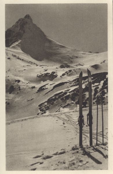 Widok na Rohacz Ostry z Łopaty. Na pierwszym planie wbite w śnieg narty.