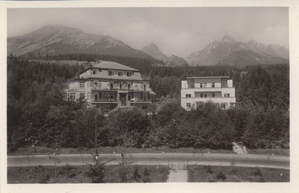 Pensjonaty w Górnym Smokowcu. W dole Droga Wolno¶ci. W tle Sławkowski Szczyt, Po¶rednia Grań i grupa Łomnicy.