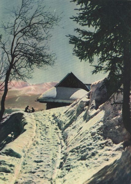 ośnieżona droga prowadząca do chaty góralskiej, po lewej stronie dwóch górali tnących drzewo.