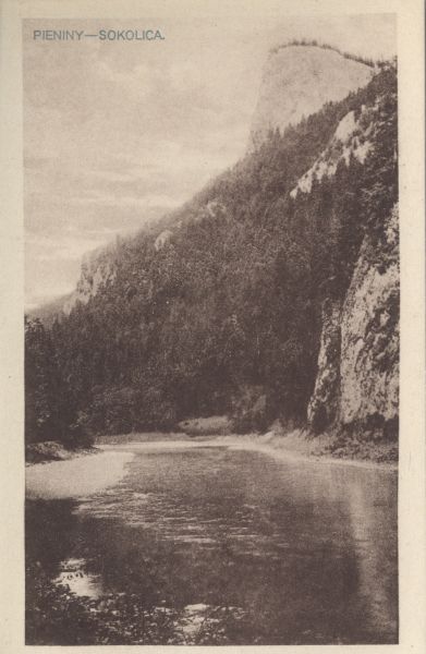 Dunajec w Pieninach. Nad nim Sokolica. U góry po lewej stronie nadruk: PIENINY - SOKOLICA.