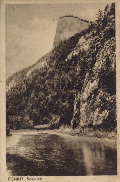 Sokolica w Pieninach. Pod nią płynie Dunajec. Pod zdjęciem drukowany tytuł: PIENINY. Sokolica.