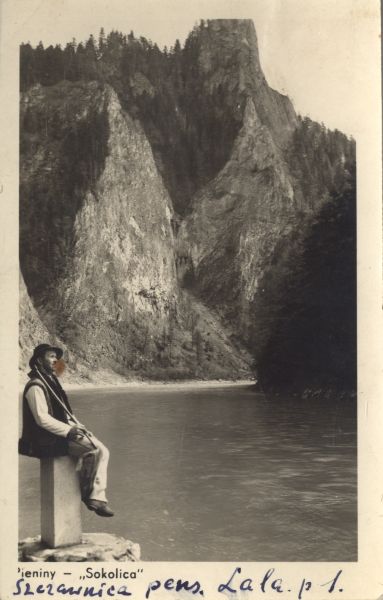 Sokolica w Pieninach. W dole płynie Dunajec. Na brzegu siedzi góral. Pod zdjęciem napis: Pieniny - "Sokolica".