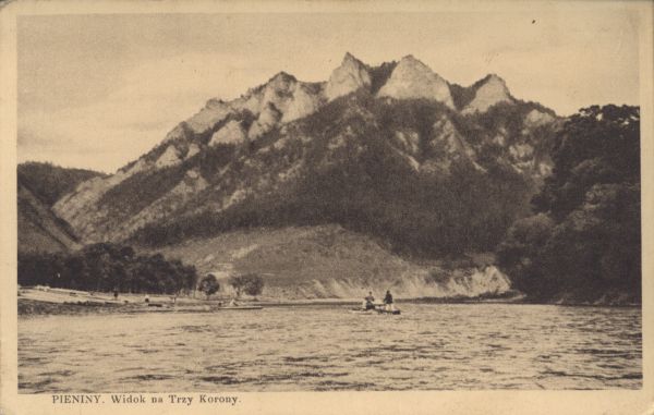 Widok na Trzy Korony z Czerwonego Klasztoru. W dole płynie Dunajec. Na rzece tratwy. Pod zdjęciem drukowany tytuł: PIENINY. Widok na Trzy Korony.