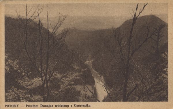 Widok na Przełom Dunajca z Czertezika. Pod zdjęciem drukowany tytuł: PIENINY - Przełom Dunajca widziny z Czertezika.